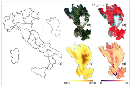 Location of the Maiella National Park, Abruzzo, Italy (a). L8 median RGB (b) and composite infra-red (c) images. Elevation in meters a.s.l. (d) and slope in percentage (e) derived from Shuttle Radar Topography Mission Digital Elevation Model (SRTM DEM).