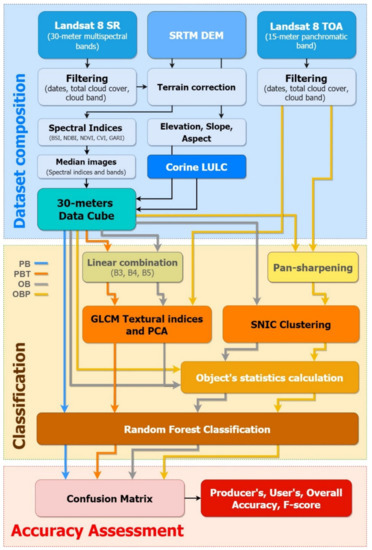 Flowchart of the methodology (Pixel-based, PB; Pixel-based including the image textural information, PBT; Object-Based, OB; Object-Based using the L8 15-m panchromatic band, OBP).