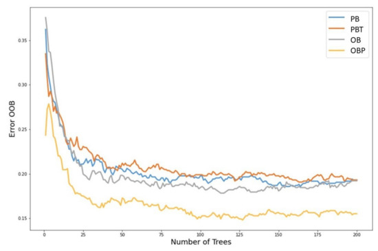 Out-Of-Bag (OOB) error vs. the number of trees for the four tested approaches (Pixel-based, PB; Pixel-based including the image textural information, PBT; Object-Based, OB; Object-Based using the L8 15-m panchromatic band, OBP).