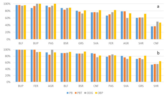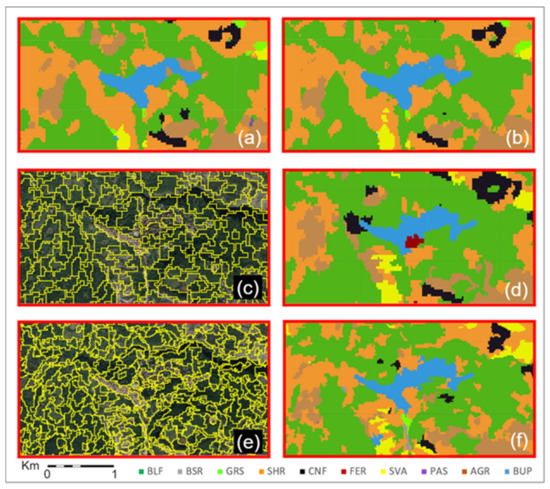 A deeper insight into the reliability of the results is provided by comparing the average PA and UA for the LULC classes (Figure 8). From the producer’s perspective (omission errors), the OB approach generally performs better or equal to the other approaches in classifying all the classes except AGR, which is slightly better classified by the PB approaches. In general, two classes result in the most problematic: CNF mainly due to the confusion with SHR and BLF, SHR due to the confusion with GRS and BLF. The OBP approach improves remarkably the PA of the latter and that of the FER. From the user’s perspective (commission errors), the OBP approach significantly improves the accuracy of UA of BSR, GRS, BLF, and SHR classes.