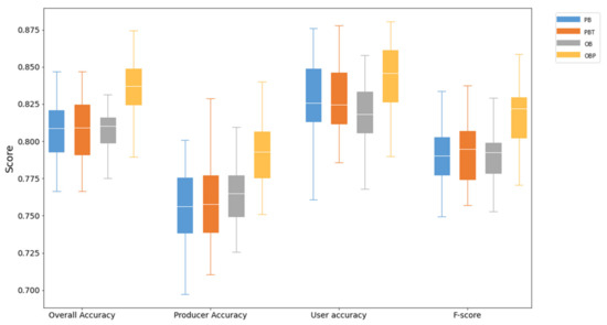 Boxplots showing the median values and the variability of OA (Overall Accuracy), PA (Producer’s Accuracy), UA (User’s Accuracy), and F-score for the four tested approaches after 50 iterations. Each graph shows the median value (Q2), the interquartile range (IQR: Q3–Q1), and the upper and lower limits (1.5 times the IQR). (Pixel-based, PB; Pixel-based including the image textural information, PBT; Object-Based, OB; Object-Based using the L8 15-m panchromatic band, OBP).
