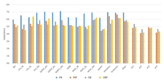 Average normalized importance of RF classification features for the four approaches (Pixel-based, PB; Pixel-based including the image textural information, PBT; Object-Based, OB; Object-Based using the L8 15-m panchromatic band, OBP). Codes used for LULC classes are described in Table 1.