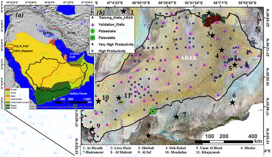- Sultan, M.; Sturchio, N.; Al Sefry, S.; Milewski, A.; Becker, R.; Nasr, I.; Sagintayev, Z. Geochemical, isotopic, and remote sensing constraints on the origin and evolution of the Rub Al Khali aquifer system, Arabian Peninsula. J. Hydrol. 2008, 356, 70–83. [Google Scholar] [CrossRef]