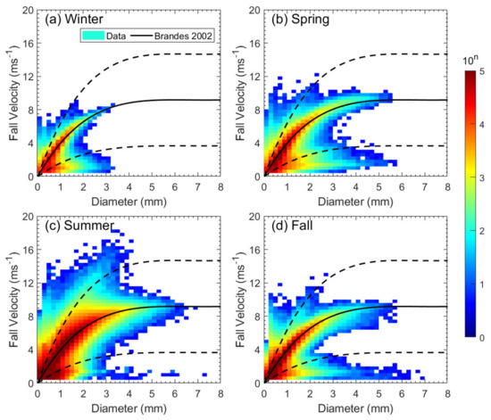 The distributions of the drop count on a log scale at different diameter size and fall velocity bins during different seasons: (a) Winter; (b) Spring; (c) Summer; (d) Fall. The black solid and dashed lines indicate the drop terminal velocity calculated using the model in Brandes et al. [18] and its ±60% bounds, respectively.