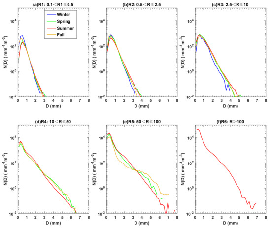 Composite DSD of different rain types during four seasons in Beijing: (a) R1: 0.1 < R ≤ 0.5; (b) R2: 0.5 < R ≤ 2.5; (c) R3: 2.5 < R ≤ 10; (d) R4: 10 < R ≤ 50; (e) R5: 50 < R ≤ 100; (f) R6: R > 100.