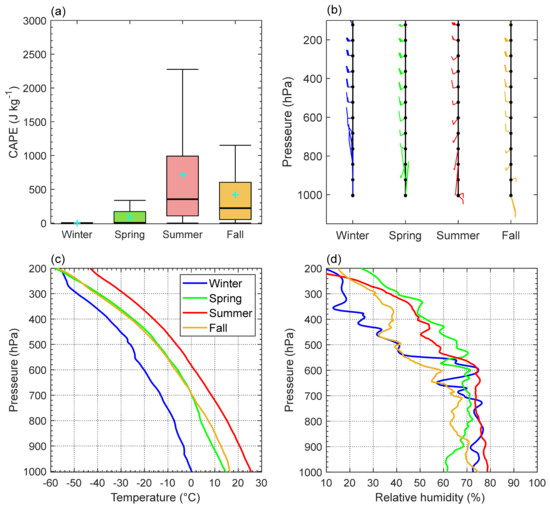 To explain the seasonal variations of DSD as discussed above, some environmental factors are collected and analyzed. As shown in Figure 5a, the CAPE (convective available potential energy per unit mass) [38] values for the rainy days calculated from the radiosonde data at Beijing site during different seasons are depicted with box-whisker plots. The vertical profiles of mean wind field, temperature, and relative humidity obtained from the radiosonde observations for the rainy days in the four seasons are depicted in Figure 5b–d.