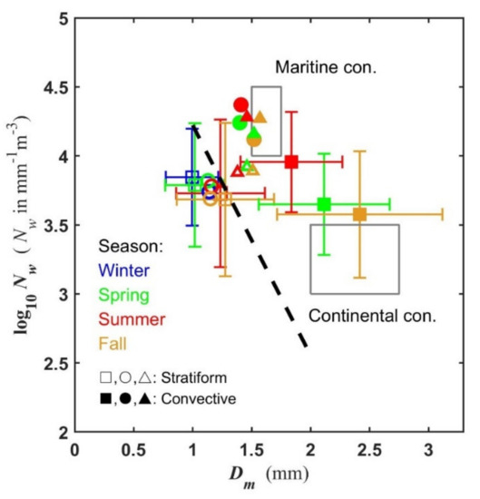 Previous studies [42,43,44] showed that the different microphysical processes between the maritime and continental convective storms induce considerably different behaviors in the DSD parameters of Nw and Dm. In this study, convective rainfall is not similar to either continental or maritime convective precipitation. The CR in summer and fall slightly tends to the “maritime cluster” and “continental cluster”, respectively.