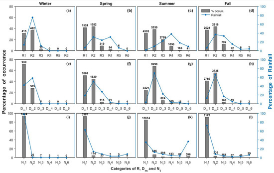 Seasonal variations of the percentage of occurrence frequency (POF) (grey bar) as well as the percentage of rainfall contribution (PRC) (blue dot-line) to the total seasonal rainfall from (a–d) R, (e–h) Dm, and (i–l) Nt bins. The number above each bar denotes the occurrence number of each class.