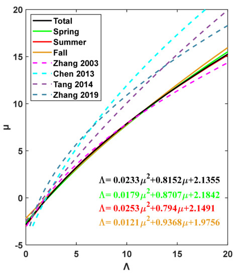 µ–Λ relations for different seasons and the whole dataset from 2016 to 2018 in Beijing depicted by the solid lines. The dashed lines indicate the μ–Λ relations derived from the measurements in Florida (the magenta dashed line) and other different parts of China (e.g., Nanjing, Zhangbei, and Zhuhai denoted by the cyan, purple, and blue dashed lines, respectively).