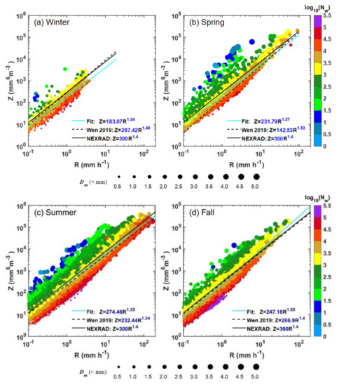 Scatterplots of reflectivity (Z: mm6 m−3) vs. rain rate (R: mm h−1) color-coded by log10Nw during different seasons: (a) Winter; (b) Spring; (c) Summer; (d) Fall. The size of the circles represents the magnitude of Dm. The fitted power–law Z–R relations for the four seasons (the cyan lines); the Z–R relationship for each season in Eastern China [36] (black dashed lines); and the standard WSR-88D Z–R relationship, i.e., Z = 300R1.4 (black solid lines) are also depicted.