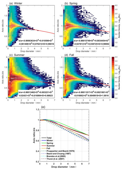 As shown in Figure 10a–d, the frequency distribution characteristics of axis ratio versus diameter for all seasons are relatively consistent, although the fourth-order polynomial fitting formulas change with the season. The fourth-order polynomial mean axis-ratio relations for the whole dataset and the different seasons are given in Equations (12)–(16), respectively: