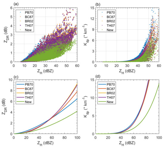 Scatter plots of ZDR (a) and Kdp (b) as a function of reflectivity ZH derived from the 2DVD observations using the T-matrix scattering appraoch at X-band frequency with different mean axis-ratio relations. The fitting curves of ZDR-ZH (c) and Kdp-ZH (d) for different axis-ratio relations (i.e., PB70, BC87, BR02 and TH07) as well with the new axis-raio relation Equation (12) obtained in this study.