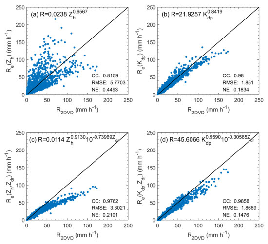 To further investigate the impact of the raindrop shape on the polarimetric rainfall estimations, the rain rate Re estimated from various QPE algorithms based on polarimetric variables (Table 4) was compared with R derived directly from 2DVD results—Equation (6). The evaluation metrics to quantify the performance of each QPE algorithm include the correlation coefficient (CC), root-mean-square error (RMSE), and the normalized absolute error (NE). They are calculated according to Equations (17)–(19):