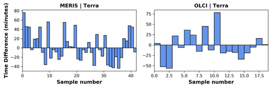 The time differences of the final image pairs were considered acceptable. The largest time difference in the overflight times between the two different spacecraft was 78 min (Figure 3). The average time difference between MERIS and MODIST’s data acquisition was 26 min, with MODIST having an earlier overpass 19 times and MERIS having an earlier overpass 23 times. The OLCI and MODIST image pairs were similar with an average time difference between image acquisition of 25 min, with MODIST having an earlier overpass 8 times and OLCI having an earlier overpass 11 times.