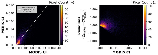 The pixel-to-pixel matchups for all MERIS-MODIST CI pairs in Supplementary Table S1 produced a slope of 2.76 with an R2 of 0.82 (Figure 4 (left)). The residuals (or difference between pairs) in Figure 4 (right) suggests a skewed error distribution, with a high density of pixels below the zero residual line. The correction factor using the pixel technique to convert from MODIST to MERIS is