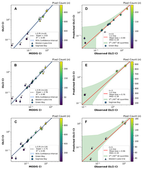 Various calibration fit parameters. Panel (A) shows the fit between MODIS TERRA and OLCI using image pairs from western Lake Erie and Saginaw Bay. Panel (B) shows the fit between MODIS and OLCI using image pairs from western Lake Erie and Green Bay. Panel (C) shows the fit between MODIS and OLCI using image pairs from Green Bay and Saginaw Bay. Panel (D) shows the observed OLCI CI to predicted OLCI CI from Green Bay. Panel (E) shows the observed OLCI CI to predicted OLCI CI from Saginaw Bay. Panel (F) shows the observed OLCI CI to predicted OLCI CI from western Lake Erie.