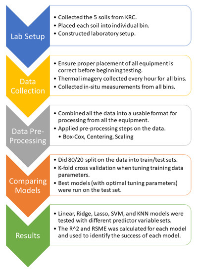 In future research, we hope to examine soil types beyond the five examined here, including those that have of organics present. The use of drones and satellites, which have a larger area coverage and different spatial resolutions is of great interest for seeing how the model holds up at the various scales and heights. All our current sensors are UAS mountable and can therefore be taken out into the field for testing at various heights and resolutions. This also adds more real-world data scenarios and larger sample sizes. The use of hyperspectral data could add extra information to classify the soil type, instead of using dummy variables, and improve the prediction accuracy of these models. Lastly, collecting a much larger sample size could lead to using deep-learning methods that would not only to check the accuracy of our current models, but also possibly improve our predictive capabilities, especially when we begin to examine more soil types and conditions.