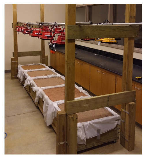 The soils were organized in the lab into five separate bins of approximately 2 × 2 × 1 ft. (length × width × height). Heat sources, two 500 W work lights, were then placed above each bin. The work lights were mounted on two horizontal metal poles, as shown in Figure 3. These heat sources were approximately 1 m above the soil surface to allow for full and even coverage of the exposed soil. This was done to provide the means of examining temperature change over time and allow enough distance above the soil to image the entire surface area without capturing the work lights in the thermal image.