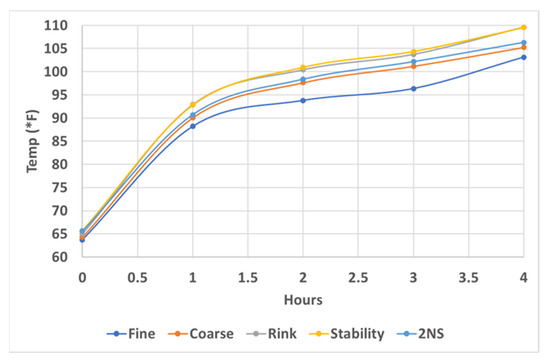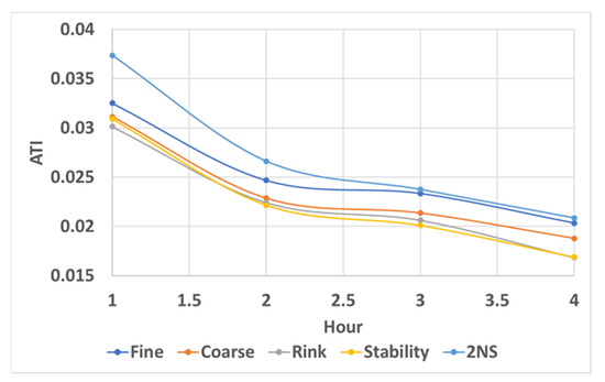 The temperature change of the soil over time had an overall increasing effect but began to level off after about 2 h. The soils still changed uniquely for the next hour, but at hour 4, the different soils hit their threshold and began to converge, as seen in Figure 4. The 3 h mark is approximately where the diurnal cycle temperature change would be; however, testing was done to 4 h to see where the soils’ temperatures would begin to converge (or rather become oversaturated). Correspondingly, we noticed the ATI of the soils decreasing over time and following a similar plateau shape; see Figure 5. To maximize the performance among the machine learning models, the ATI at the 3 h mark was used as it provided the best distinction between the five soil types. Recalling Equation (4), the ATI showed a roughly mirror image to that of the temperature change because the larger the temperature change, the smaller the ATI value, as seen in Figure 5.