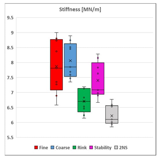 Box plot of the soil stiffness values [MN/m] for each of the individual soil types from all laboratory trials.