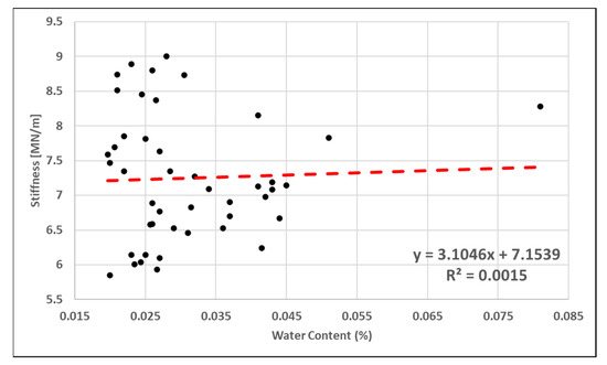 The data were then organized and loaded into Python for processing. Box plots of the samples’ stiffness values are shown below in Figure 6. When examining all the samples, one saw that there was a range of strength values that came in a variety of conditions. It was also apparent that a simple linear correlation to either ATI (Figure 7) or moisture content (Figure 8) alone was not possible, further validating the need to build a more complex model with multiple predictors.
