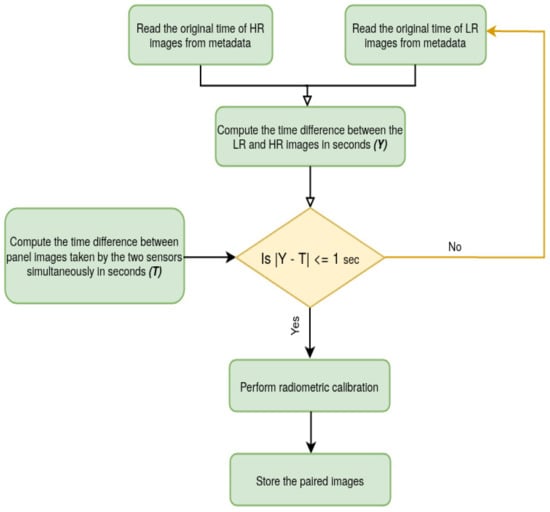 As the two sensors were not synchronized during flight, we first need to find closely matching LR and HR pairs based on their relative timestamp. To pair training images, we extract the metadata from images of the CRP captured by the two sensors simultaneously. The metadata Original DateTime of the two images are parsed to acquire the time difference between the two sensors, enabling the computation of a threshold value used for matching images with maximum spatial overlap. Figure 2 formally describes the image matching process between LR and HR images, while calibrating the LR images radiometrically.