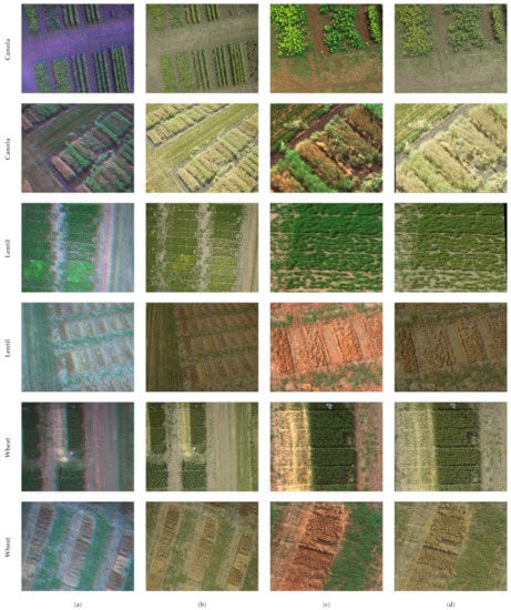 Each dataset covers a diverse range of genotypes. The canola field has 56 varieties of canola, such that substantial variations exist in appearance in the dataset. The wheat field contains 17 varieties in microplots, while the lentil field has 16 varieties in microplots. The wheat or lentil trial has 47 rows and 12 columns of microplots in three aligned blocks. The spacing between rows within a plot in the canola trial and in the lentil and wheat trials were approximately 0.3 m and 0.6 m, respectively. Low sowing density was observed in the lentil field and normal sowing density in the canola and wheat fields [79,80].