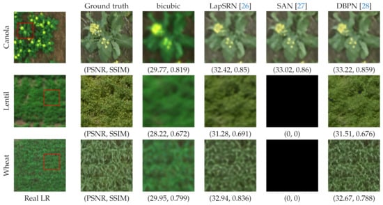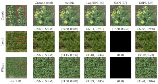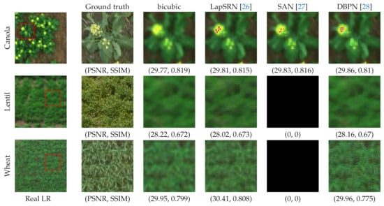 We evaluate the performance of super resolution models on our dataset, employing the synthetic-synthetic, synthetic-real, and real-real experiments. Table 3 and Table 4 represent the performance of the models over the PSNR and SSIM values. In the synthetic-synthetic experiment, deep learning models were able to reconstruct reasonable quality images for the canola and three-crop datasets, but they did not outperform the bicubic interpolation for the lentil and wheat datasets. The results for the synthetic-real experiment indicate that the super resolution models cannot generalize to unseen data. For all crops, models trained on synthetic data resulted in a substantial drop in performance when tested with real-world LR images. The results of the real-real experiment demonstrate that the super resolution models have learnt how to handle unknown blur and noise within the LR images. The models performed well on the canola and three-crop datasets. The sensor’s resolution differences caused indistinct reconstructed images in the lentil and wheat datasets, especially where small representations are missing in the LR input image.