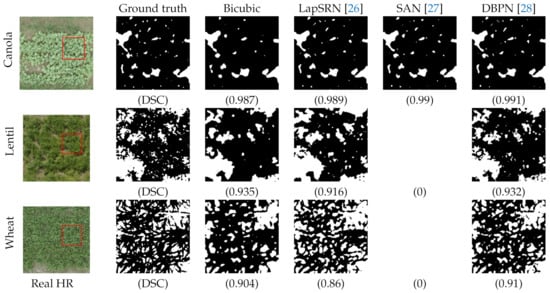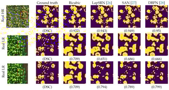 Coarse spatial resolution is likely to increase the number of mixed pixels in aerial images, where the major proportion of the objects existing in a mixed pixel determine the identity of ground objects [39]. To some extent, spectral unmixing can handle the identity of mixed pixels, but it cannot provide spatial distribution information for remote sensing images [40]. The super resolution approach is a process of improving details within an image, predicting finer spatial resolution, especially where the details are essentially unknown to reduce the spatial uncertainty in output images. A finer spatial resolution results in smaller pixel sizes and fewer mixed pixels in an image [41].