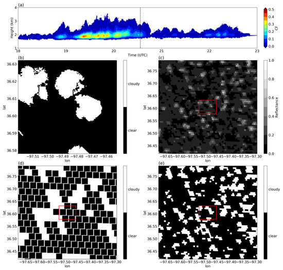 (a) Time evolution of the vertical profile of cloud fraction on 11 July 2018 from Clouds Optically Gridded by Stereo (COGS) data product with a dash line plotted over 20:33:40 UTC; (b) cloud mask from COGS for a 6 km by 6 km domain with a spatial resolution of 50 m on 20:33:40 UTC 11 July 2018; (c) GOES-16 reflectance in the red band (0.64 μm) with a spatial resolution of approximately 650 m; (d) GOES-16 cloud mask based on ABI Clear Sky Mask (ACM) data product with spatial resolution of 2 km on 20:33:43 UTC 11 July 2018; (e) new cloud mask derived from the method developed in this study with spatial resolution of approximately 650 m. Red boxes in (c), (d), and (e) correspond to the COGS 6 km by 6 km domain. Shallow cumulus clouds, which were captured by DOE ARM surface stereo cameras, are not fully reported by the GOES-16 ACM data product but are successfully detected by the new method developed in this study.