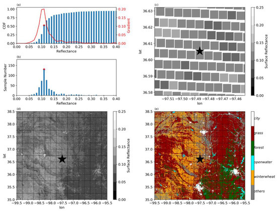 Clear-sky surface reflectance is determined at high resolution (ABI pixel size, approximately 650 m at SGP) based on an algorithm in [53] and [52] that we describe below. In [49], it was confirmed that the patterns of clear-sky radiation using this algorithm agree well with the MODIS albedo maps. The assumption for this algorithm is that land surfaces are stable and slow-varying over a restricted time period and that the signal measured by the GOES instrument during this period can be considered only a function of the scene-viewing geometry and cloudiness [54]. In this study, clear-sky surface reflectance climatology maps are generated for July–August based on data in 2018 and 2019. To reduce the diurnal variability effects from the solar zenith angle, while at the same time still retaining sufficient data, clear-sky surface reflectance climatology for July–August is calculated per pixel per hourly interval using 45 randomly selected days in July and August over the 2-year period. Figure 2a shows that, for each pixel, 540 reflectance values (45 days × 12 observations per hour) are sorted to generate a cumulative distribution frequency (CDF) on 21 UTC (15 local time) with the bin spacing of 0.01. The clear-sky surface reflectance is determined as the reflectance value with the greatest gradient along the curve of the CDF. The greatest gradient corresponds to the change from cloud shadow to clear-sky surface. The reflectance values smaller than the determined surface reflectance correspond to the cloud shadow [54]. The sample numbers in each bin are shown in Figure 2b. To generate the CDF, adequate clear-sky cases are needed. Among the randomly selected 45 days, manual case screening of satellite images confirms around half of the cases as clear sky. The spatial variabilities of the clear-sky surface reflectance are clearly seen within the COGS 6 km by 6 km domain (Figure 2c). The surface reflectance values in a 4° by 3.5° large domain centered at the COGS location are also calculated and shown in Figure 2d. It is found that the clear-sky surface reflectance agrees well with the land cover map (Figure 2e), in which higher surface reflectance is found over city and over grassland than over forest. The reflectance is small over open water in general, except for the solar salt plant region (−99.25°, 36.75°) in Figure 2e. The land cover map for the year 2018 is from the Cropland Data Layer dataset (https://nassgeodata.gmu.edu/CropScape/ (accessed on 11 September 2020).) hosted by CropScape for the continental United States, which has a 30-m spatial resolution [55,56]. This surface reflectance method works well when the land surface conditions (e.g., vegetation) are stable and vary slowly. A more detailed discussion can be found in Section 5.