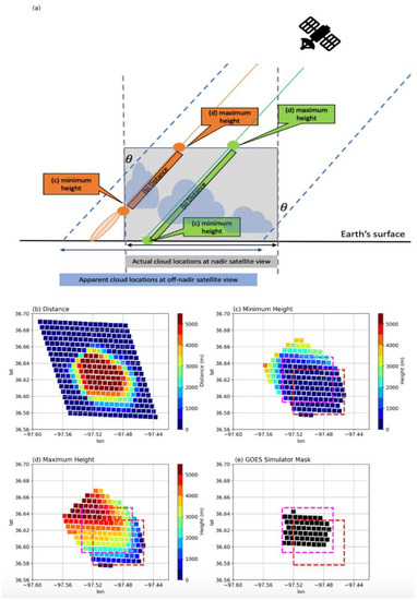 (a) Sketch of the projected location of a cloud on the Earth’s surface, seen from nadir and from GOES with a satellite zenith angle (θ). The gray box represents the 6 km × 6 km × 6 km COGS domain, where ShCu can be observed by surface stereo camera system. A GOES simulator is developed, projecting clouds observed by surface stereo cameras towards the land surface along the GOES-16′s slanted viewing direction. Two example simulator slanted paths (green and orange lines) are provided in (a). For green path, the minimum and maximum heights are 0 km and 6 km. For orange path, the minimum height is around 3 km, much higher than 0 km. (b) The distance passing through the COGS reconstructable region along the path from the GOES-16 satellite to the GOES pixel at surface. The (c) minimum and (d) maximum heights of the COGS reconstructable region intercepted by paths from the GOES-16 satellite to the GOES surface pixel. (e) A mask of the GOES simulator. Each marked (black) point at surface in (e) corresponds to one GOES slanted viewing path. Along these marked slanted viewing paths, pixels below 6 km seen by GOES are all within the 6 km × 6 km × 6 km COGS domain. In (c) to (e), the red box is the actual location of the COGS domain, and the magenta box, as a reference, is a shifted domain of the same size, 0.015° north and west of the COGS domain, due to the GOES slanted view.