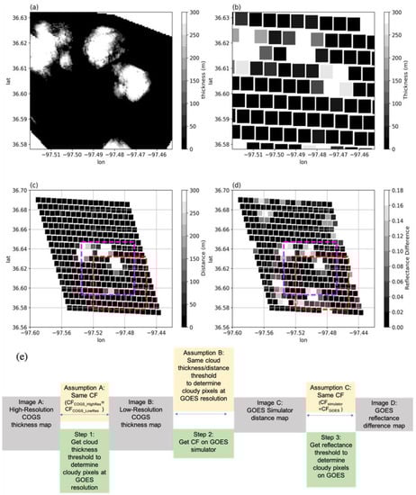 The estimation of the ShCu detection threshold ∆R is based on four images (Figure 4a–d): (Image A) a high-resolution (50 m) cloud thickness image from the COGS data; (Image B) a low-resolution (at GOES resolution) cloud thickness image derived from the high-resolution COGS data; (Image C) a cloud path distance image from the GOES simulator; and (Image D) a reflectance difference image from the GOES-16.