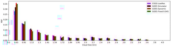 The cloud size distribution from COGS at GOES resolution (low-resolution COGS) is also plotted in Figure 6. The difference between the distributions derived from GOES and COGS LowRes may be because (1) the cloud sizes are enlarged when seen from GOES at a slanted view compared to the cloud sizes projected in the zenith view from the COGS data product; (2) the smaller clouds can be partially or fully blocked by larger clouds from the GOES simulator due to the slanted view. Because of the two effects mentioned above, the CFs from nadir view and from slanted view are not the same.