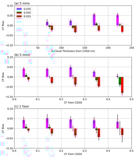Using 5 min data, the mean CF bias using different ΔR values is further calculated with respect to the different ranges of in-cloud thickness, which is the mean thickness of the cloudy pixels on each COGS image (Figure 8a). In general, the mean bias is very close to zero when ΔR equals 0.045, much smaller than when using 0.035 or 0.055. The mean bias is negative (positive) when the in-cloud thickness is less (greater) than 150 m, but the CF mean bias values are always within ±0.013. The mean CF bias values are also calculated in the different CF ranges (Figure 8b). Using ΔR as 0.045, the mean biases are within ±0.02 when CF is less than 0.4. When CF is larger than 0.4, using a smaller ΔR (e.g., 0.035) yields better results than using 0.045. However, the occurrence probability of continental shallow cumulus CF larger than 0.4 is very small [11,62]. In the comparisons of hourly mean CFs estimated using dynamic and constant ΔR thresholds (Figure 8c), the mean biases are within ±0.01 in all the CF ranges when using ΔR of 0.045.