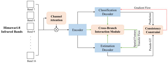On the one hand, we introduce a consistency constraint mechanism into the loss function. To ensure the consistency of the predictions of the two parallel tasks, the mechanism calculates the consistency loss of the classification and estimation branch. In the process, we take the predictions of the estimation branch as the pseudo ground-truth. Thus, the information captured by the estimation branch can be propagated back to the classification branch via gradients to improve the information abundance and the classification accuracy of the classification branch. On the other hand, we propose a cross-branch interaction module (CBIM). It transmits the spatial features of the classification branch to the estimation branch and realizes the soft transfer and fusion of features between the two parallel branches. In addition to alleviating the dilemma of data imbalance, it also reduces the error accumulation (Error accumulation refers to the transfer of errors from the classification model to the estimation model in the process of using classification results to balance the data distribution for the estimation task) caused by the two-stage framework. The combination of the above two aspects forms a positive-going information propagation cycle of “estimation-classification-estimation”, and the experiments demonstrate that such design can achieve higher accuracy for precipitation estimation. Moreover, to explore the correlation between infrared bands of different wavelengths of Himawari-8, we introduce a channel attention module [38] before the encoder. By designing the corresponding experiments of different precipitation intensities, we obtain the change of the correlation of each infrared band under different precipitation intensities. During the experiments, we take the Himawari-8 data with 10 infrared bands as the input of the models and use the GPM data as the ground-truth for supervision.