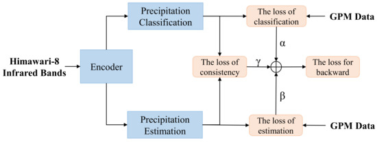 In recent years, the two-stage framework has been widely used in the deep-learning study of precipitation estimation [30,31,32,33], which including a preliminary “rain/no-rain” binary classification and a non-zero precipitation estimation. The core of the two-stage framework is utilizing the results of the binary classification task as the masks to filter the no-rain data of the precipitation estimation task and alleviate the data imbalance problem. To a certain extent, utilizing the masked data to train the precipitation estimation model could reduce the bias of the model for no-rain data which accounts for a large proportion. It has been proved that the two-stage framework with deep learning methods has the ability to provide more accurate and reliable precipitation estimation products than the PERSIANN products.