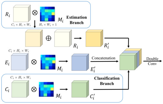 where * indicates the element-wise multiplication operation. Then, we introduce the features from the classification branch, which can be denoted by , to the estimation branch. Specifically, we utilize the above attention mask to get the region-aware classification features, and the obtained features () are concatenated with the enhanced feature maps , the corresponding enhanced features () in the encoder. This process can be calculated as follows: