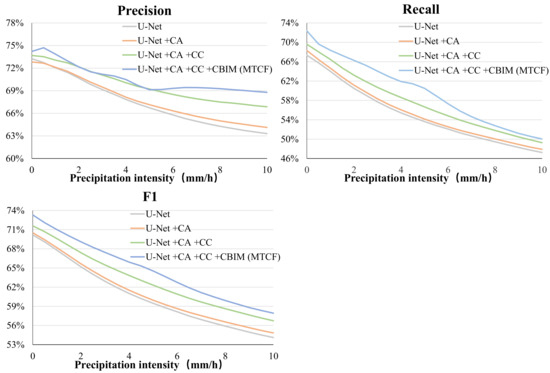 In order to verify the generalization ability of our model, we conduct the experiments of precipitation estimation on the test set of IRPD. In order to quantitatively and intuitively evaluate the performance of the model under different precipitation intensities, we defined a threshold set of precipitation intensity from 0.5 to 10 with an interval of 0.5. Based on this set, we plotted the precision, recall, and F1 values of the model with the change of precipitation intensity, which is shown in Figure 7.