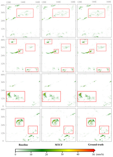 The visualization comparison of our MTCF with the baseline U-Net. There are four examples in the figure, one for each row. The four precipitation events from top to bottom occurred at 13:30 on 2 June 2019, 8:30 on 19 June 2019, 2:00 on 16 July 2019, and 17:00 on 10 October 2019, respectively. The last example contains the precipitation of Typhoon Hagibis in 2019.