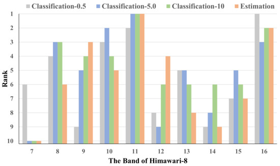 To explore the importance of each infrared band in Himawari-8 for precipitation with different intensities, we perform a series of comparative experiments. Specifically, we insert the channel attention module before the encoder of the classification and estimation model of precipitation intensity 0.5, 5.0, and 10, respectively, and output the channel weights of input bands obtained in each model. The corresponding results are shown in Figure 9. As the weight represents the relative importance of each band in the model, it is difficult to make a direct comparison between different models. We sort the band weight values of each model to facilitate the comparison between models. The sorted results are shown in Figure 10.