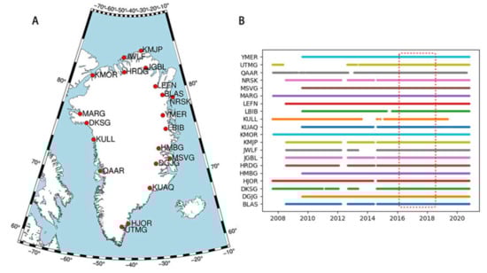 The GPS time series records used in this study are downloaded from the Nevada Geodetic Laboratory, the University of Nevada at Reno (http://geodesy.unr.edu/NGLStationPages/GlobalStationList, accessed at 12 May 2021) [32], and correspond to IGb2014 products. On the basis of the distribution and integrity of the GPS time series, we select 20 GPS stations in Greenland. Figure 2A shows the location of the 20 GPS stations, and Figure 2B shows the observation epochs of all sites. We focus on the vertical component of the GNSS coordinate time series. The average missing rate of all of the time series is 13.28%. We use time series from January 2016 to June 2018 because the time series of this period has no gaps.