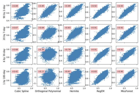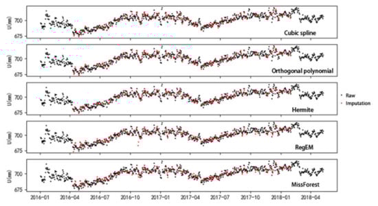 For the imputation results of the 6 by 30-day gap data of the different methods, one trial of the imputation results is shown in Figure 6. The results of cubic spline and orthogonal polynomial in Figure 6 have large biases from the true value, and the MAE of the orthogonal polynomial in Table 1 is larger than 19 mm. The Hermite methods produce over-smooth results with respect to the other methods because Hermite requires the values of functions on nodes and the values of corresponding derivatives (even those of higher derivatives) to be equal. The correlation coefficient of the orthogonal polynomial is below 0.7. The Rp, MAE, and NRMSE of missForest are 0.92, 2.71 mm, and 0.065, respectively. The results of the methods using temporal correlation are smoother than those of the methods using spatial correlation, and the MAE and NRMSE of RegEM and missForest are smaller than those of the others. The methods that use temporal correlation cannot react to complicated time variations, obtain poor results with a large gap size, and may result in artificial signals.