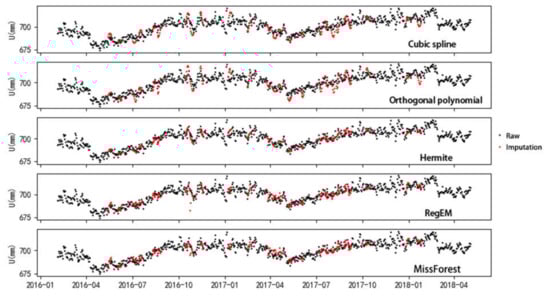 For the imputation results of the 20 by 7-day gap data of the different methods, one trial of the imputation results is shown in Figure 5. Cubic spline and orthogonal polynomial show large fluctuations in Figure 5 because these methods become unstable when the gap size increases. As shown in Table 1, the MAE of orthogonal polynomial increases from 3.67 to 6.27 mm and is worse than that of cubic spline, which means that this method is unstable for large gaps. The Rp and NRMSE of missForest are 0.92 and 0.063, respectively, and the MAE of missForest is 2.61 mm, which is increased by only 0.06 mm. The smallest degradation of missForest among all the methods means that missForest is more stable than the others. missForest uses the bootstrap approach to sample the dataset and generate many regression trees to derive the missing value. This procedure prevents any poor regression tree from affecting the overall results.