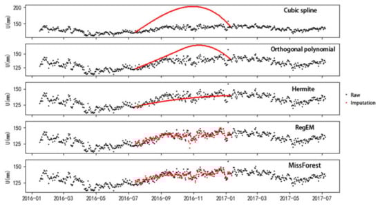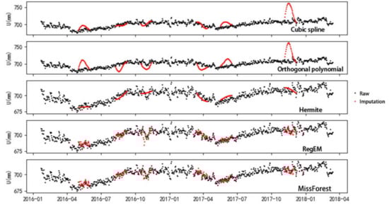 For the imputation results of the 180-day gap data of the different methods, one trial of the imputation results is shown in Figure 7. The results of cubic spline and orthogonal polynomial in Figure 7 show large deviations. Hermite only fits a major linear trend and loses many details. As indicated in Table 1, missForest has a strong linear correlation. The Rp of missForest and RegEM is 0.90 and 0.83, respectively. The MAE and NRMSE of missForest are 2.95 mm and 0.066, respectively, which are about half of the values of Hermite and cubic spline. Figure 4, Figure 5, Figure 6 and Figure 7 show that cubic spline and orthogonal polynomial are only suitable for small gap sizes. Comparison of the results of RegEM and missForest indicates that RegEM has several outliers (Figure 7), but no obvious outliers are found in the missForest method. The results of missForest outperform those of RegEM, indicating that missForest can restore more information from data than RegEM can. Moreover, the dataset (GPS coordinate time series) contains several nonlinear relationships that only missForest can restore because missForest can consider nonlinear relationships, whereas RegEM only considers linear relationships.