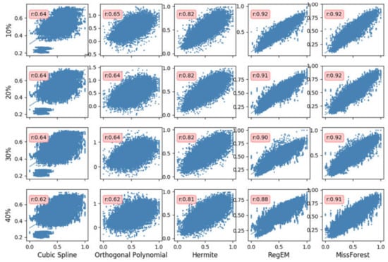 Comparison of imputed and true values with different missing rates and methods for 200 trials together. The x-axis is true values, and the y-axis is the imputation values (normalized to [0–1] for clarity).
