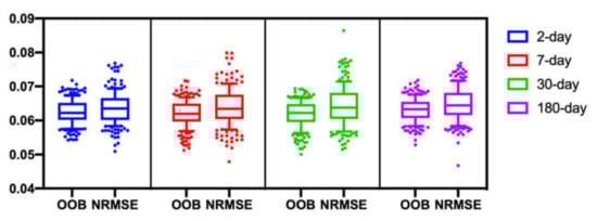 To compare the distance between OOB and NRMSE, we calculate the OOB and NRMSE of 200 trials with a gap rate of 20% and gap size of 2-day, 7-day, 30-day, and 180-day. Figure 9 shows 2-day gap size results and we can see that OOB and NRMSE are close, although OOB is a little smaller than NRMSE, which is usually caused by overfitting. The Pearson correlation coefficient of OOB and NMSE is 0.74. Figure 10 shows all results of 2-day, 7-day, 30-day, and 180-day, and we can see the OOB estimates exhibit a lot less variability than NRMSE in all gap sizes. The OOB estimates tend to slightly underestimate the imputation error with all gap sizes. However, on average, the estimation is comparably good. This result indicates that we can use OOB as the approximate value of the real NRMSE.