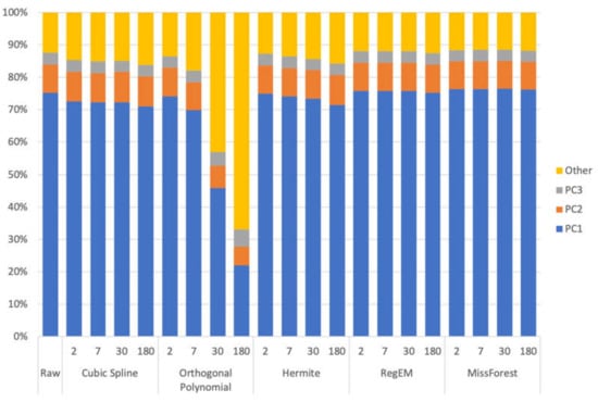 To determine the influence of different methods on PCA, we use the results of 200 trials and perform PCA on them. We compute the proportion of the variance of the first three PCs and the distance and angle of PC1 between the original data and imputed data (Table 3 and Figure 11). Figure 11 shows that the two best methods are RegEM and missForest. The other methods somewhat change the proportion of PCs. As the gap size increases, the difference between imputed and original data becomes increasingly obvious (especially for the orthogonal polynomial method) because of the instability of the temporal methods with gap size. When the gap size is 2 days, the distance of RegEM and missForest are 0.008 and 0.009, respectively (Table 3). Cubic spline and Hermite have 0.049 and 0.023, respectively, which are several times larger than those of RegEM and missForest. The angle of the results from cubic spline is the largest, whereas that from RegEM is the smallest. When the gap size increases to 7 days, the orthogonal polynomial method changes considerably. When the gap size increases to 30 days, the distance of orthogonal polynomial changes to 0.341, which is smaller than that of cubic spline, but the angle of orthogonal polynomial is 19.707, whereas that of cubic spline is 2.790. This result indicates that only distance and angle can reflect the real difference. When the gap size is 180 days, the distance of missForest is 0.024, and the angle is 1.408; both are the smallest among all the values for the compared methods. Hence, missForest can better restore the information in the time series and is more robust than the other methods using time correlation. In other words, missForest can restore abundant information from existing data, and imputed data from missForest are suitable and reliable to use in PCA.