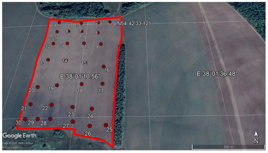 During field work conducted on the test field on 15 August 2019, we collected 30 mixed soil samples from the upper part of the arable horizon (0 to 5 cm). Each mixed sample consisted of five single sub-samples of the upper part of the arable horizon collected from the area around the sample point (approximately 1 m). Sub-samples were collected using the diagonal method at five points. We used the simple random sampling pattern. The sampling scheme is presented in Figure 1.
