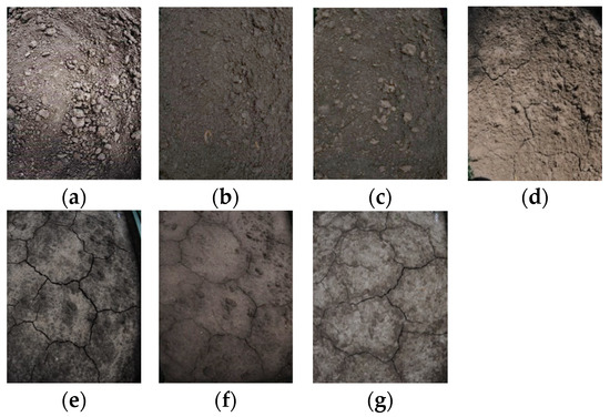 Photos of soil surface of grey forest soil in model experiment [40]: (a) 7.06.2017 (the start of the experiment); (b) 16.06.2017; (c) 26.06.2017; (d) 30.06.2017; (e) 07.07.2017; (f) 11.07.2017; (g) 25.07.2017.